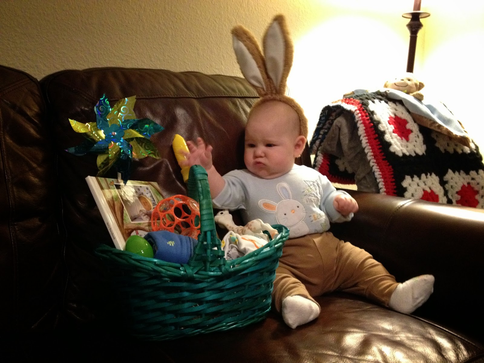 The Easter Bunny brought him a pair of bunny ears, bubbles, a pinwheel, pajamas, a ball, Sophie, and some plastic eggs with candy in them for mom and dad.